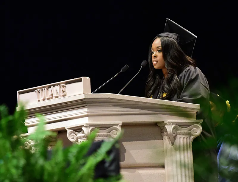 Zharia Jeffries (SLA '19) delivering her speech at the 2019 School of Liberal Arts Diploma Ceremony.